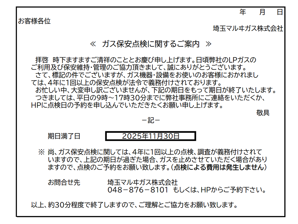 長期間点検を実施していないお客様には、期日の3か月程前にお手紙でご連絡差し上げています。以下の≪ガス保安点検に関するご案内≫が お手もとに届いているお客様は、必ずご予約いただくようにお願いします。